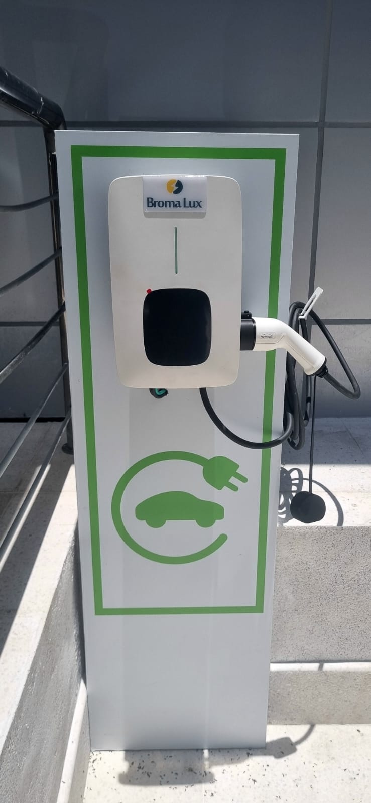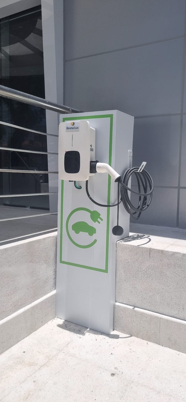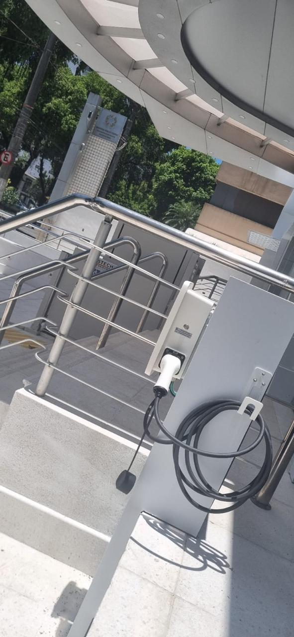 Carregador veicular instalado na cidade de Santos-SP, no Ministério Público Federal. Com potência de 7,4 kW, o equipamento é capaz de carregar completamente a bateria de um veículo em até 8 horas, oferecendo praticidade e comodidade aos frequentadores do local.